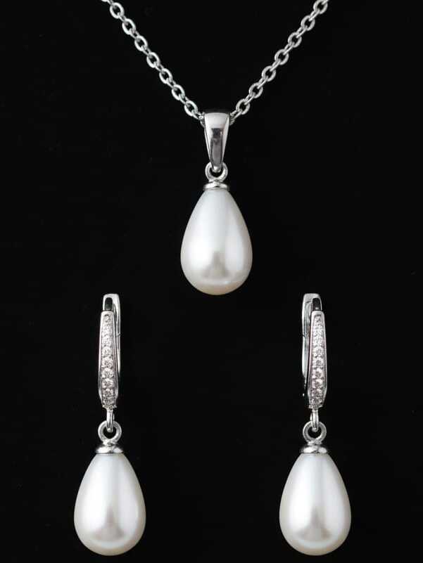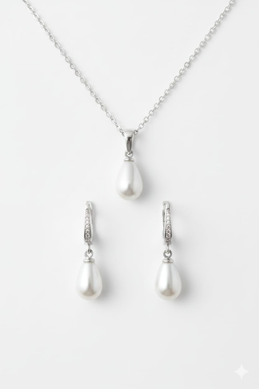925 AYAR GÜMÜŞ IŞILTILI BEYAZ İNCİ KOLYE VE KÜPE SETİ